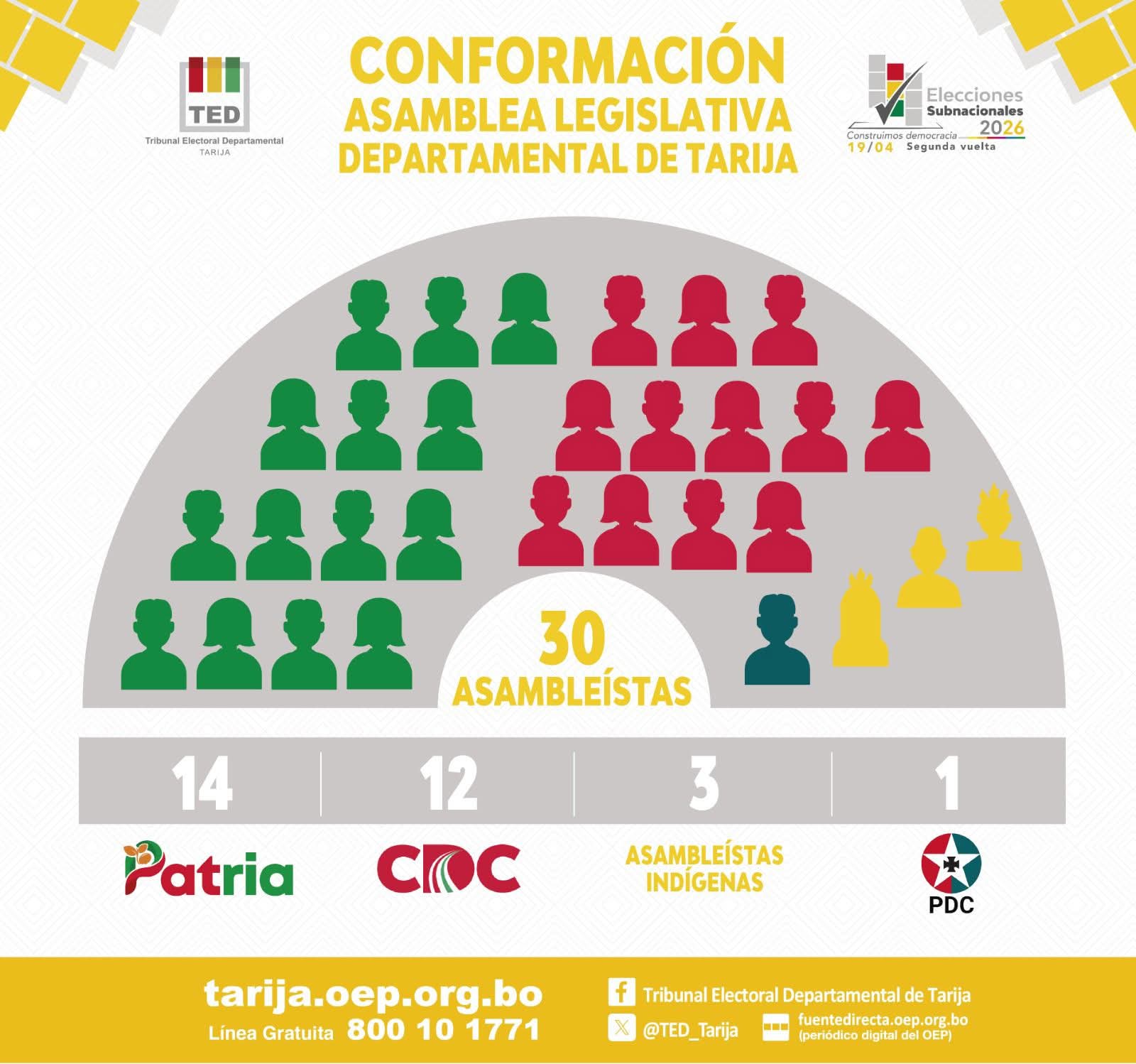El Tribunal Electoral Departamental de Tarija presentó la distribución de los 30 representantes de la Asamblea Legislativa Departamental, resultado del…