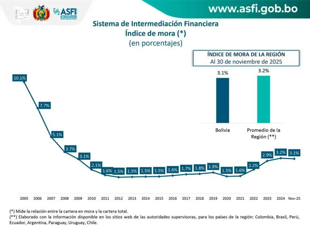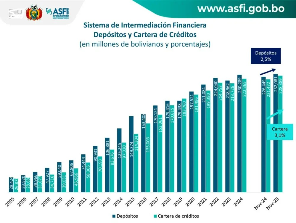 La cartera de créditos del sistema bancario boliviano cerró octubre de 2025 en 29.973 millones de dólares, con un crecimiento interanual del 3,6%, mientras los depósitos subieron apenas 2,5%. Según la Asociación de Bancos Privados de Bolivia (Asoban) y la ASFI, la expansión crediticia se desaceleró tras ajustes en las tasas de interés y menor demanda de créditos en un contexto de recesión económica y devaluación del boliviano.